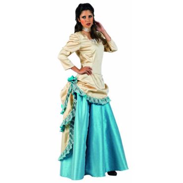 Ce costume médiéval femme comprend la longue robe bleu et beige avec frou-frou et faux-cul et le tour de cou.