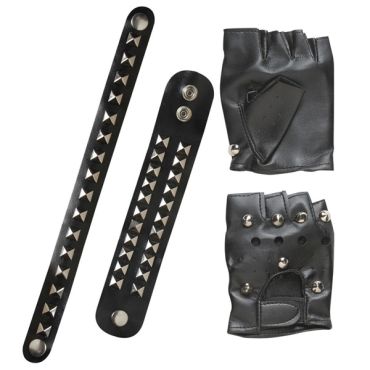 Accessoire pour déguisement punk, gant en simili-cuir (100% polyester), taille unique, décoré de clous métalliques et ses 2 bracelets, à entourer autour du poignet ou du cou.