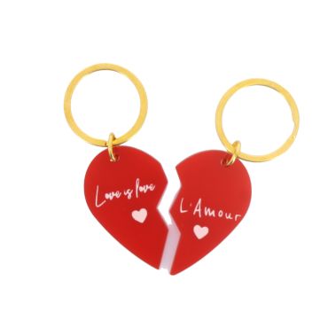Composé de deux demi-cœurs en plexiglas rouge, chacun accompagné de son anneau doré, ce porte-clés forme un cœur complet lorsqu’il est réuni, avec des inscriptions délicates évoquant l’amour, parfait pour un cadeau romantique à la fois simple et chargé de sens.